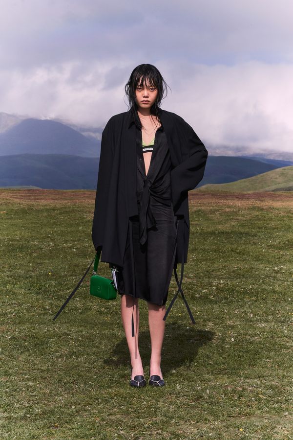 The oriental cross-collar is used as an essential feature throughout the collection, accompanied with various choices of fabric and silhouettes, forming deep emotional connections with regional folk elements. With the modern deconstruction method of SANKUANZ, the unique shape of Tibetan robes is stunningly translated into fashion, the asymmetrical oversized silhouette exuding a rough and primitive power. The wrapping design of dresses is inspired by Tibetan monks’ robes. An extravagant number of folds are formed from wrapping, stacking and twinning of fabrics around the body, creating an original abstraction. The designer reinterprets the costume of the traditional Vajra dance, launching an aesthetic exploration of the human body with a three-layered silhouette with rich folds, portraying a perfectly powerful image with traditional ethnic clothing. The unique design language of SANKUANZ reinvigorates these ancient folk elements, giving them a whole new glamour and making them an integral part of the modern fashion.